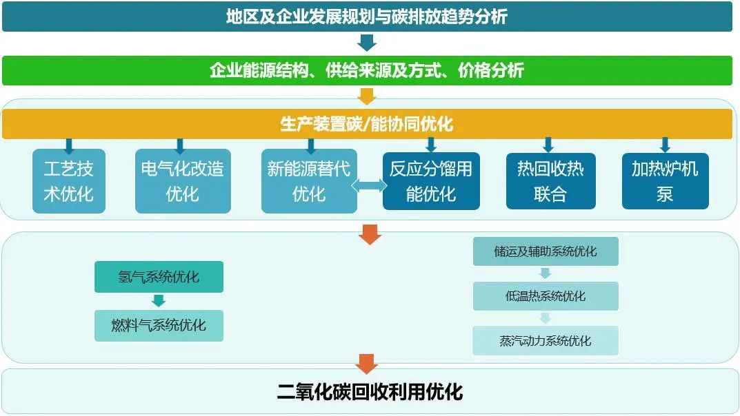 3、基于过程系统工程理念,采用系统性的碳优化技术路线,以碳排放最小化为目标,研究制定企业碳优化成套技术解决方案。