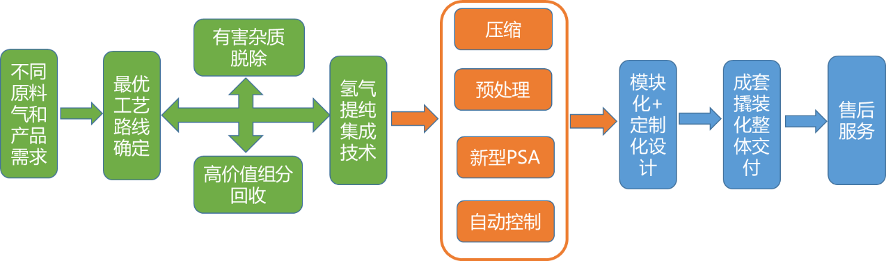 该技术是一种基于资源端富氢气体的不同场景并集成高效提纯设备的技术,通常用于石化及煤化工等领域富氢尾气的氢气提纯再利用或直接作为氢能用户的成套技术,尤其适合几百方至两万方以下的小规模分布式氢气提纯,并能满足氢能指标的提纯要求。
