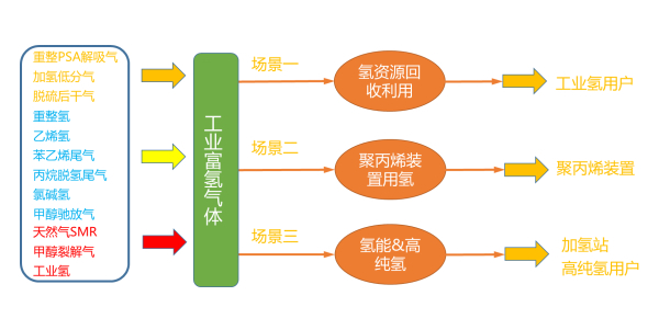 应用场景:三种典型场景包括由工业富氢气体提纯至工业氢,聚丙烯用氢,高纯氢、燃料电池用氢。